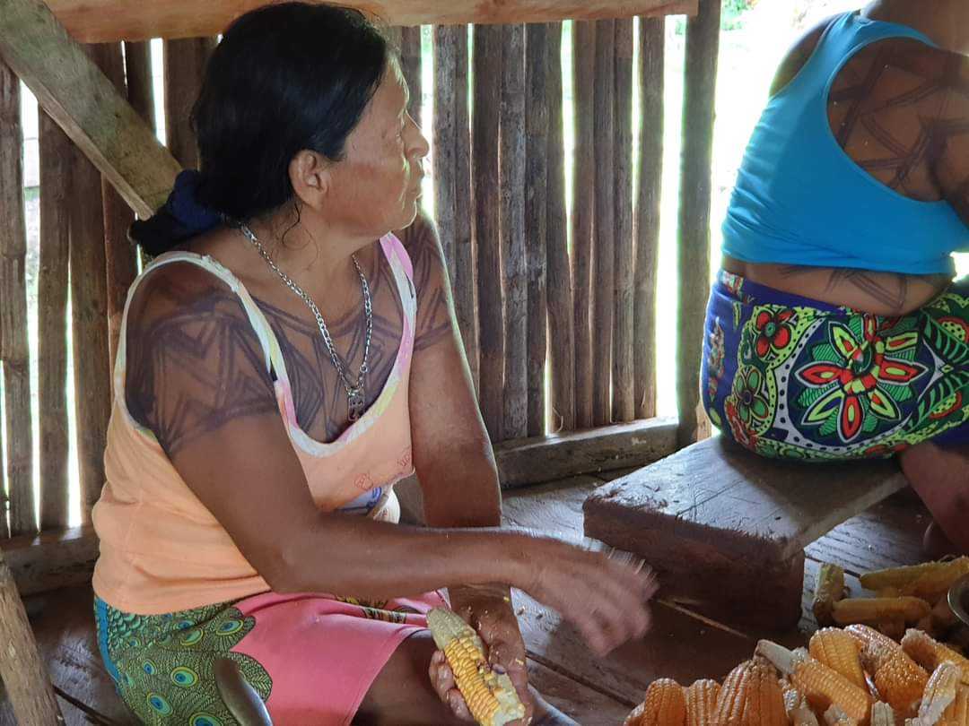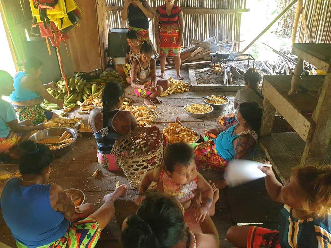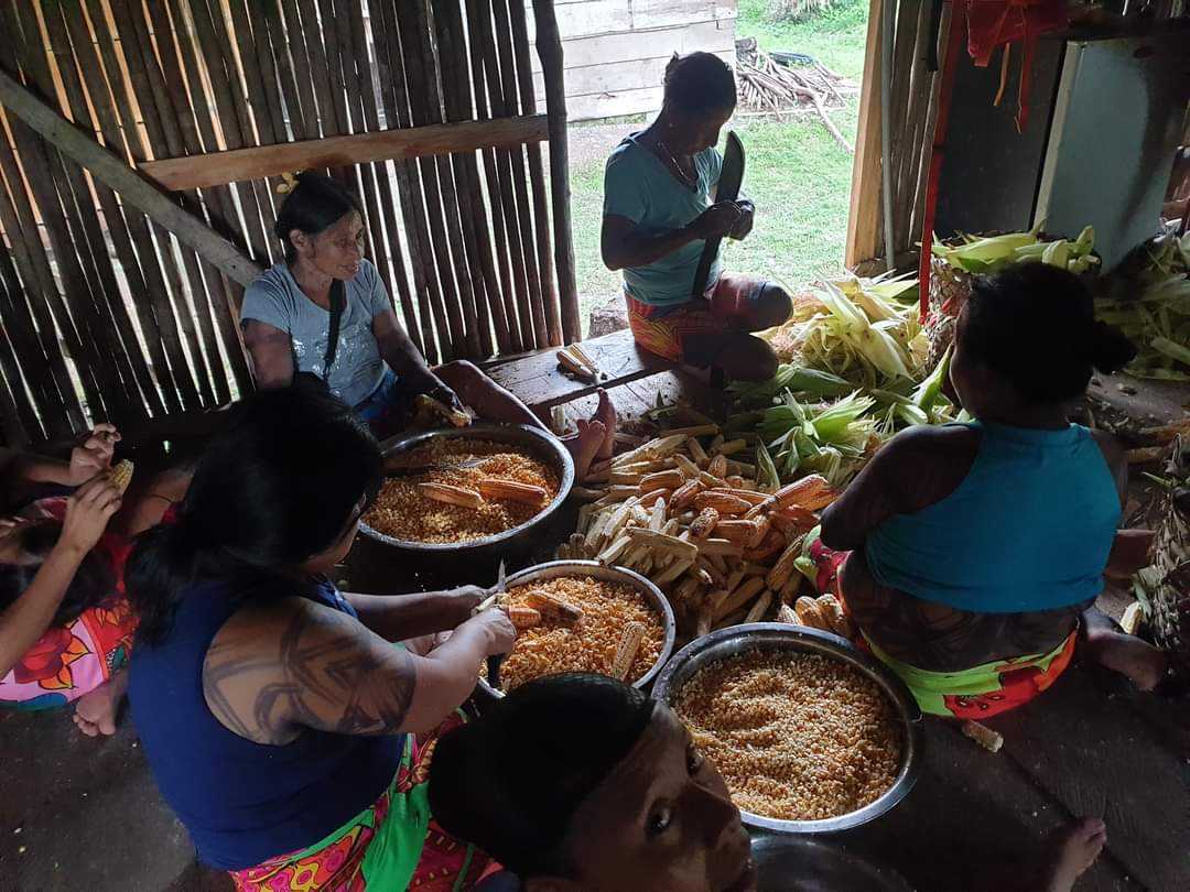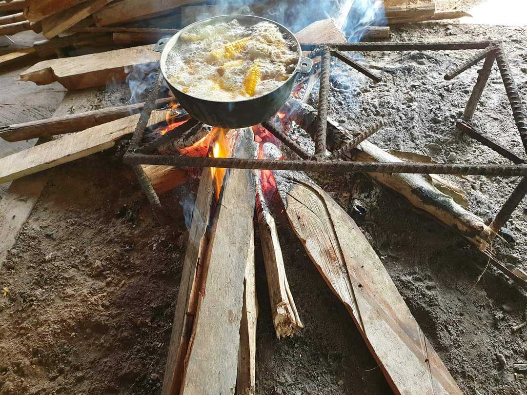 W wiosce kobiety zebrały się w naszej chacie i siedząc na podłodze oddzielały ziarna. Niektóre posługiwały się wielkimi maczetami. Potem miski z ziarnami trafiły na stół, gdzie inne z kobiet mieliły je na papkę. Sporo tego wyszło, kilka wielkich mis. W międzyczasie co ładniejsze kolby trafiały do paleniska, skąd wracały już opieczone. Pyszne takie jedzenie a jeszcze lepsze były tortille, które kobiety uformowały ze zmielonej papki. Kilka minut w gorącym oleju i placuszki gotowe.