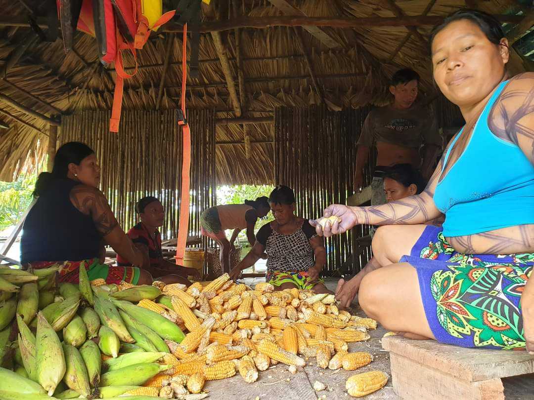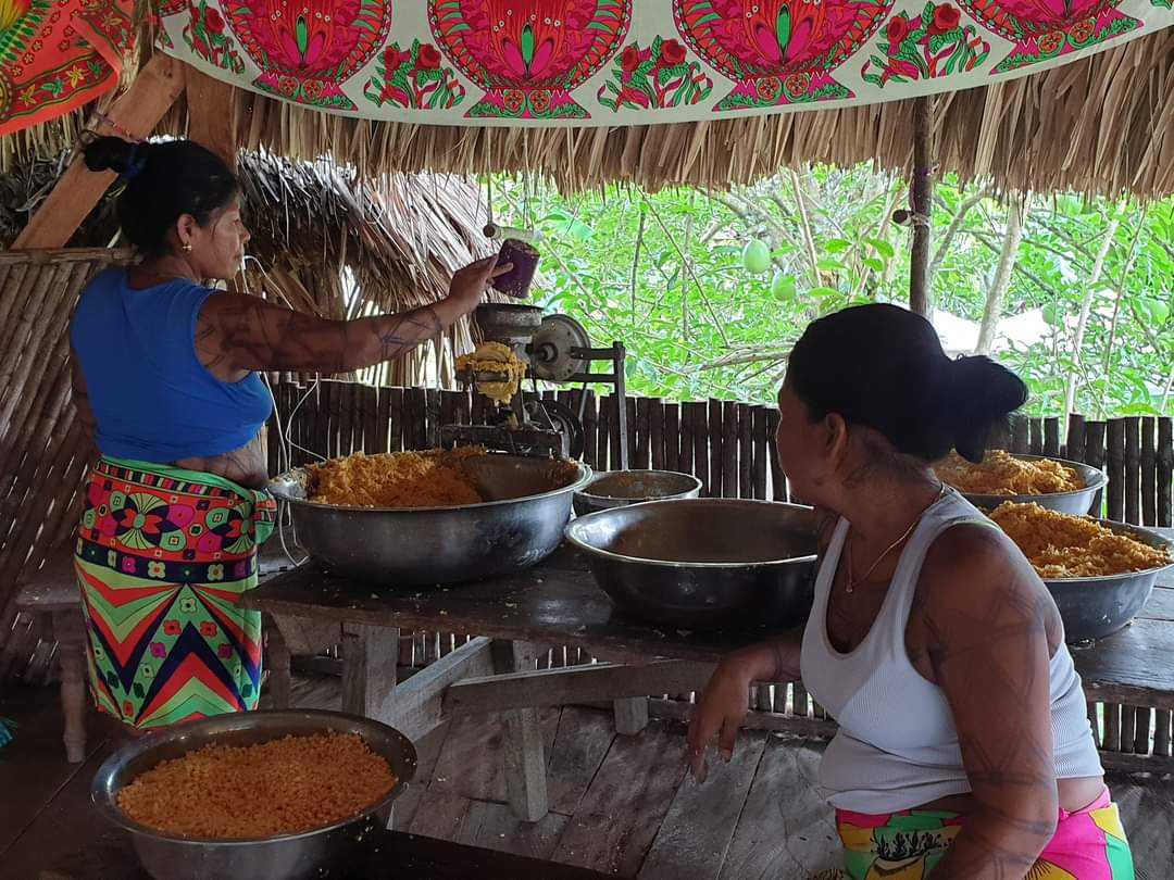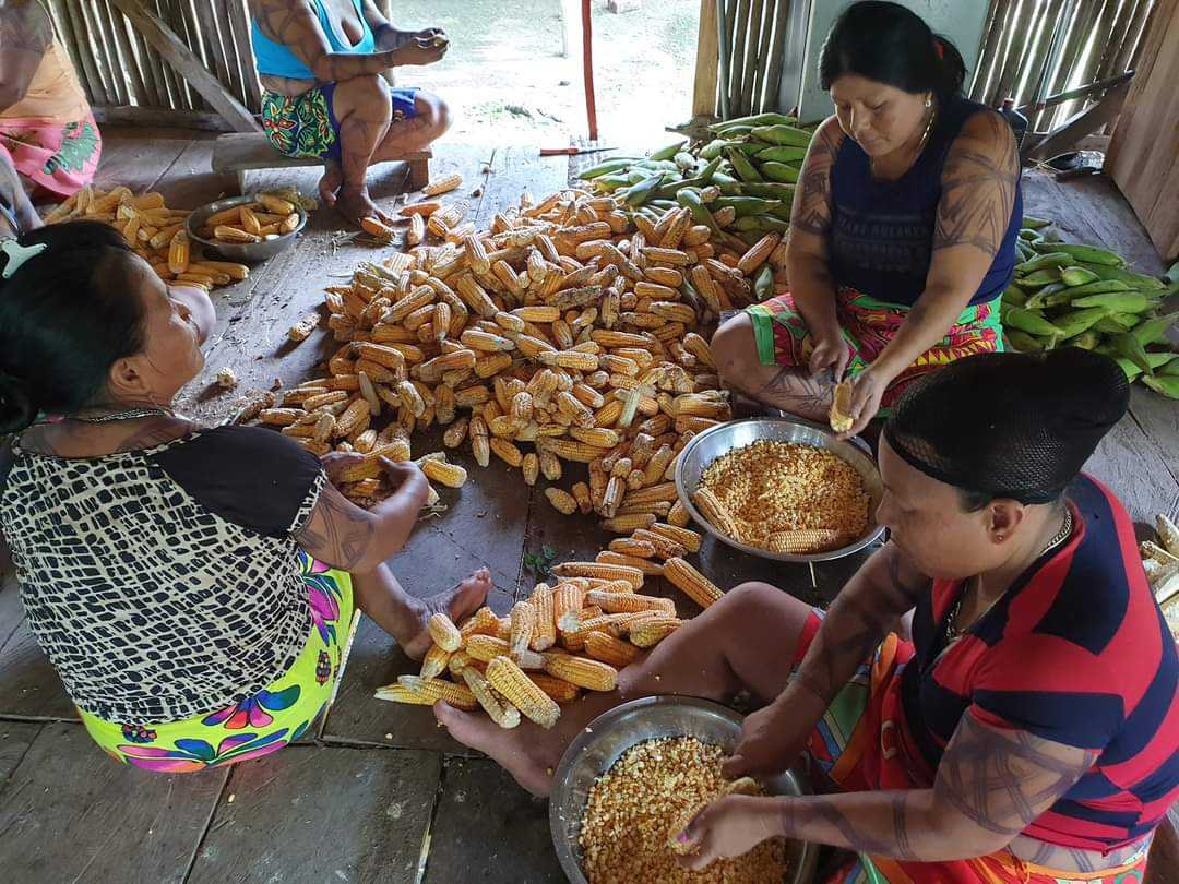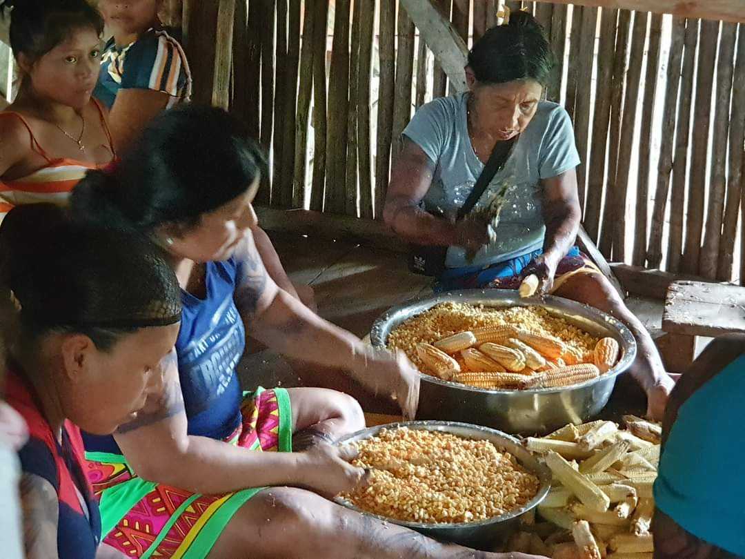 W wiosce kobiety zebrały się w naszej chacie i siedząc na podłodze oddzielały ziarna. Niektóre posługiwały się wielkimi maczetami. Potem miski z ziarnami trafiły na stół, gdzie inne z kobiet mieliły je na papkę. Sporo tego wyszło, kilka wielkich mis. W międzyczasie co ładniejsze kolby trafiały do paleniska, skąd wracały już opieczone. Pyszne takie jedzenie a jeszcze lepsze były tortille, które kobiety uformowały ze zmielonej papki. Kilka minut w gorącym oleju i placuszki gotowe.