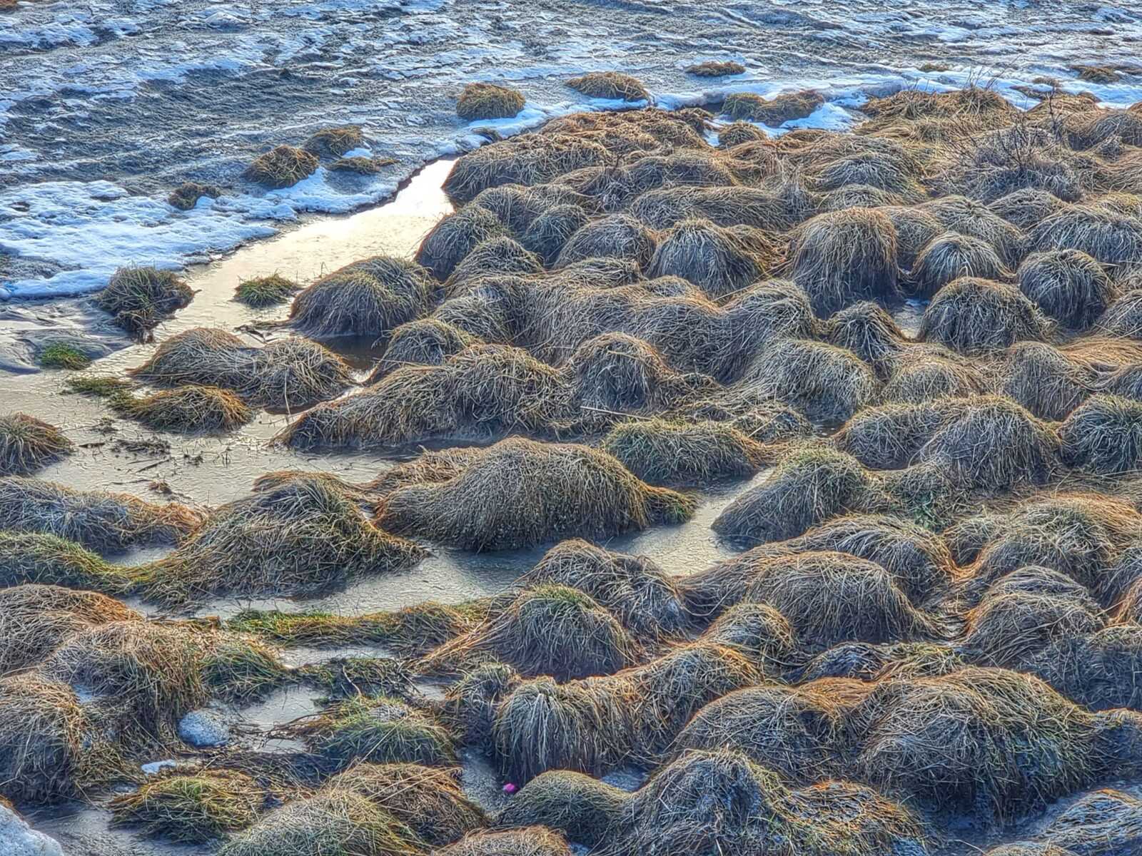Trasa zaczynała się przy nowoczesnym budynku imitującym lądującą sowę śnieżną, w którym jest muzeum lodu. Chodnik z desek był, ale tylko na samym początku. Potem woda spływająca z sąsiednich wzgórz utworzyła strumienie rozmoczonego lodu. Udało mi się je uważnie ominąć.